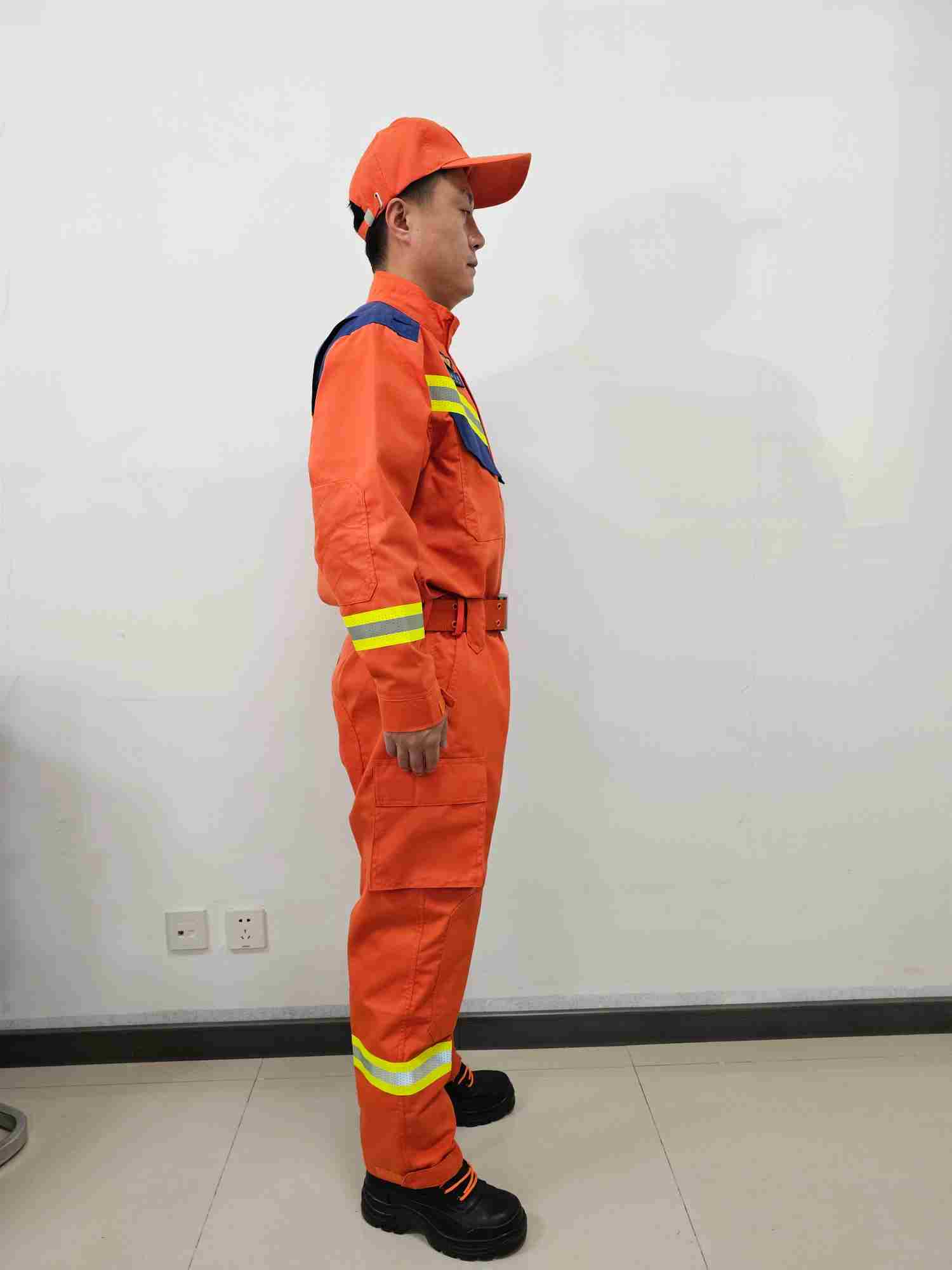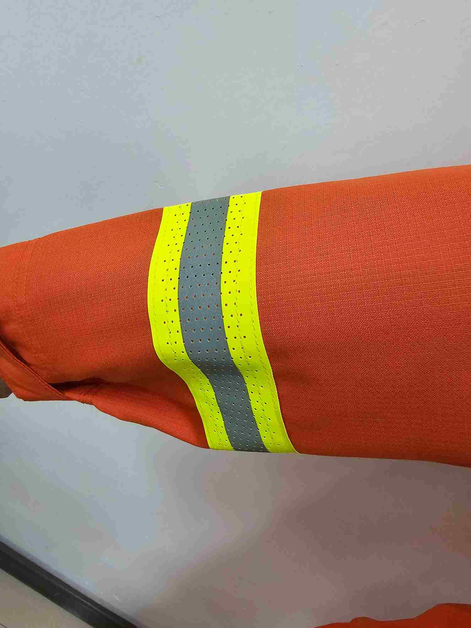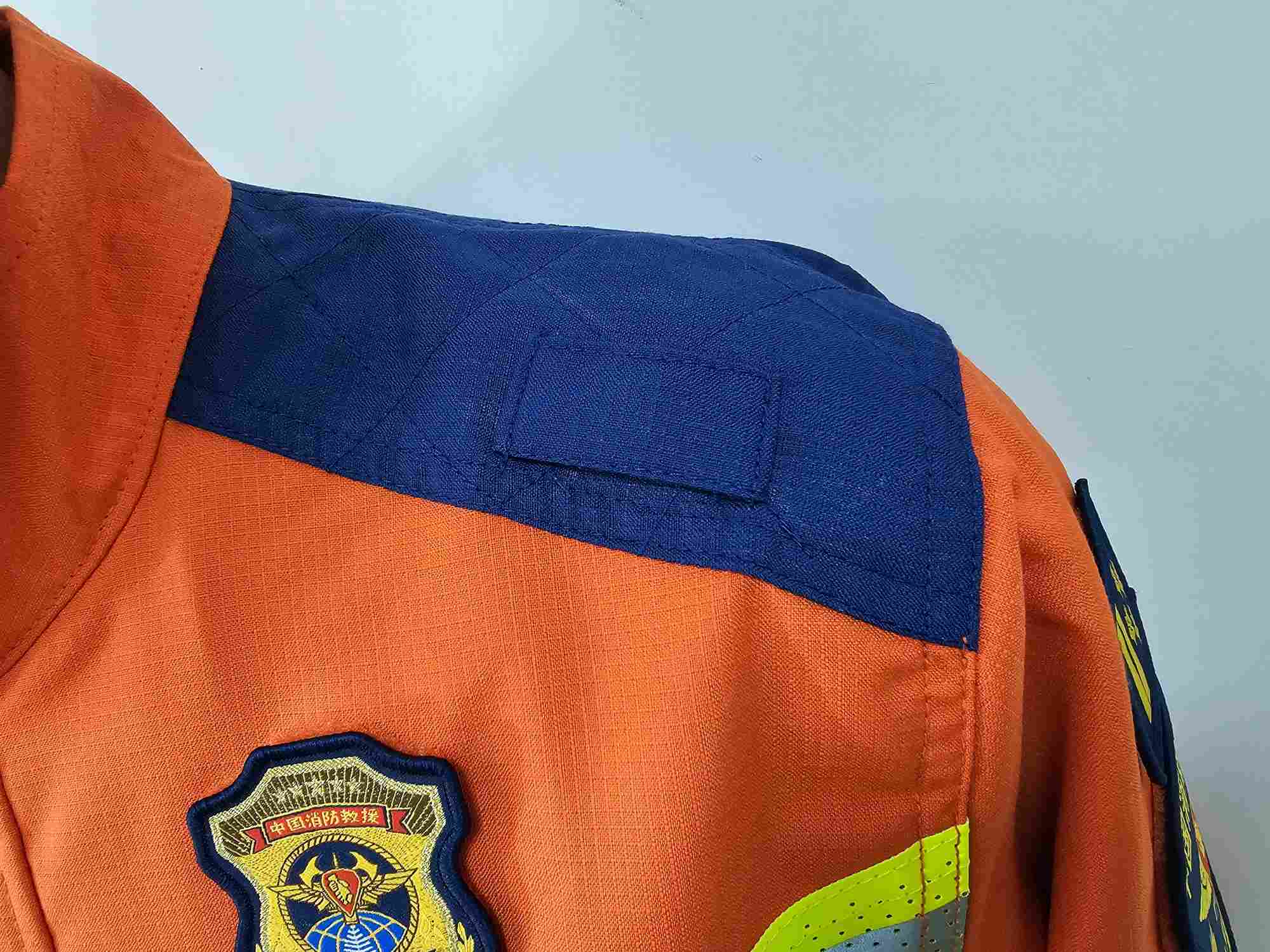采用雙層結構織法,表層面料采用芳綸橘紅面料,內層為芳綸與舒適性纖維天絲混紡,具有外防內吸、具備彈性、防靜電、阻燃、輕便、抗拉力強等性能。單位面積質量207.14g/m2,提供第三方出具的檢測報告,每套面料有面料防偽標識。